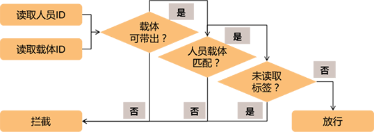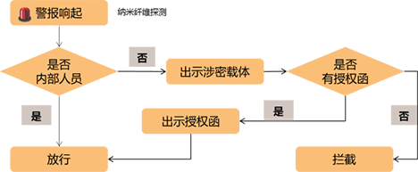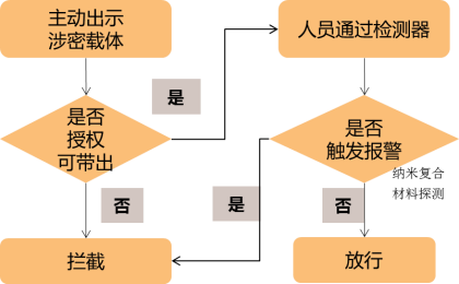 用户在涉密区域出口处设置可探测纳米纤维标签一体化检测器。检测器先读取人员 ID 及涉密载体 ID,后台根据用户预先设置的涉密介质出口管理策略,综合判断: