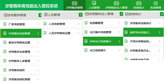 软件平台由用户管理,人员管理,涉密载体出入管理,涉密载体库存管理,信息统计,五部分组成。软件平台除了支持涉密载体/资产入库,分发,盘点管理外,还可灵活设置,授权不同级别人员,不同级别涉密载体/资产的出入口管理策略,并定期生成统计报表。